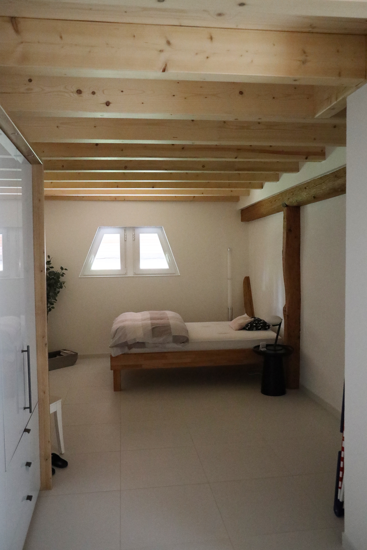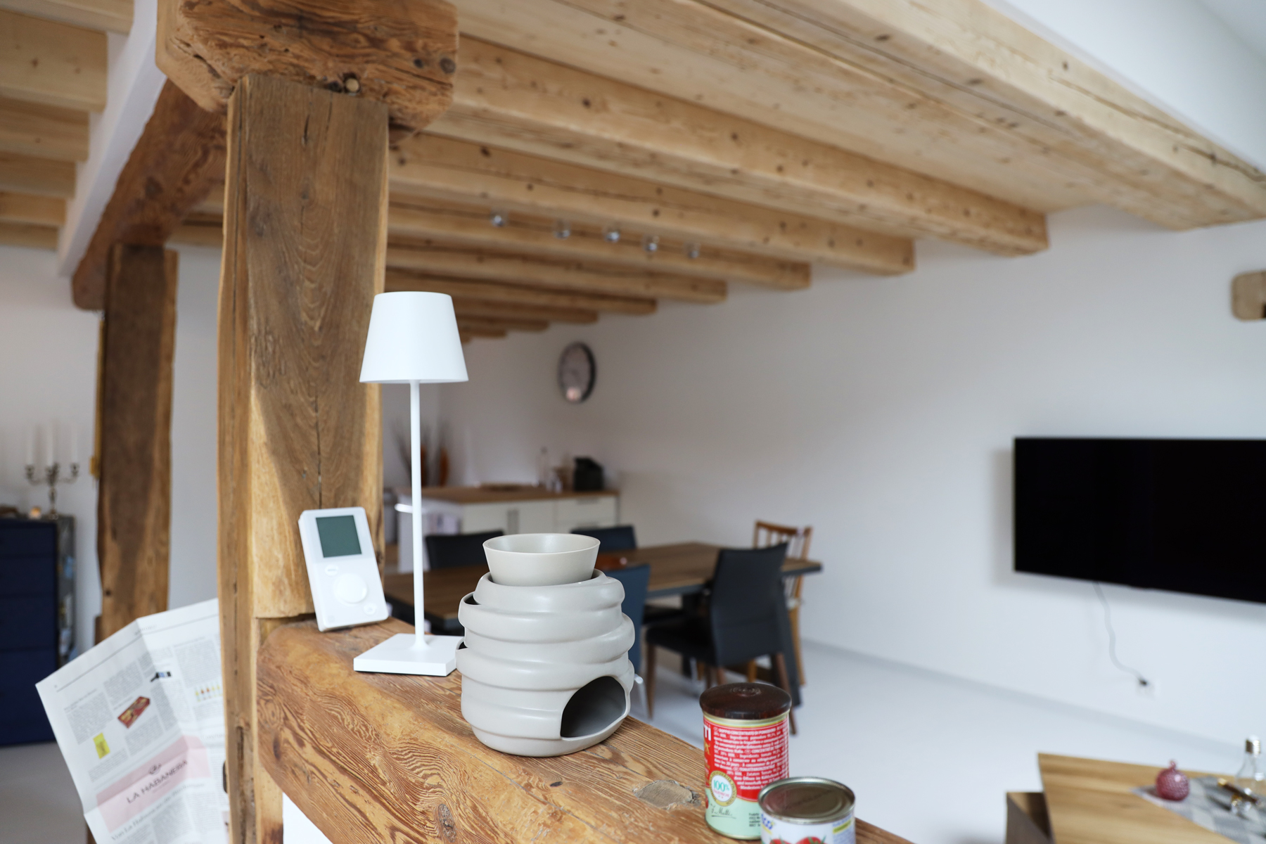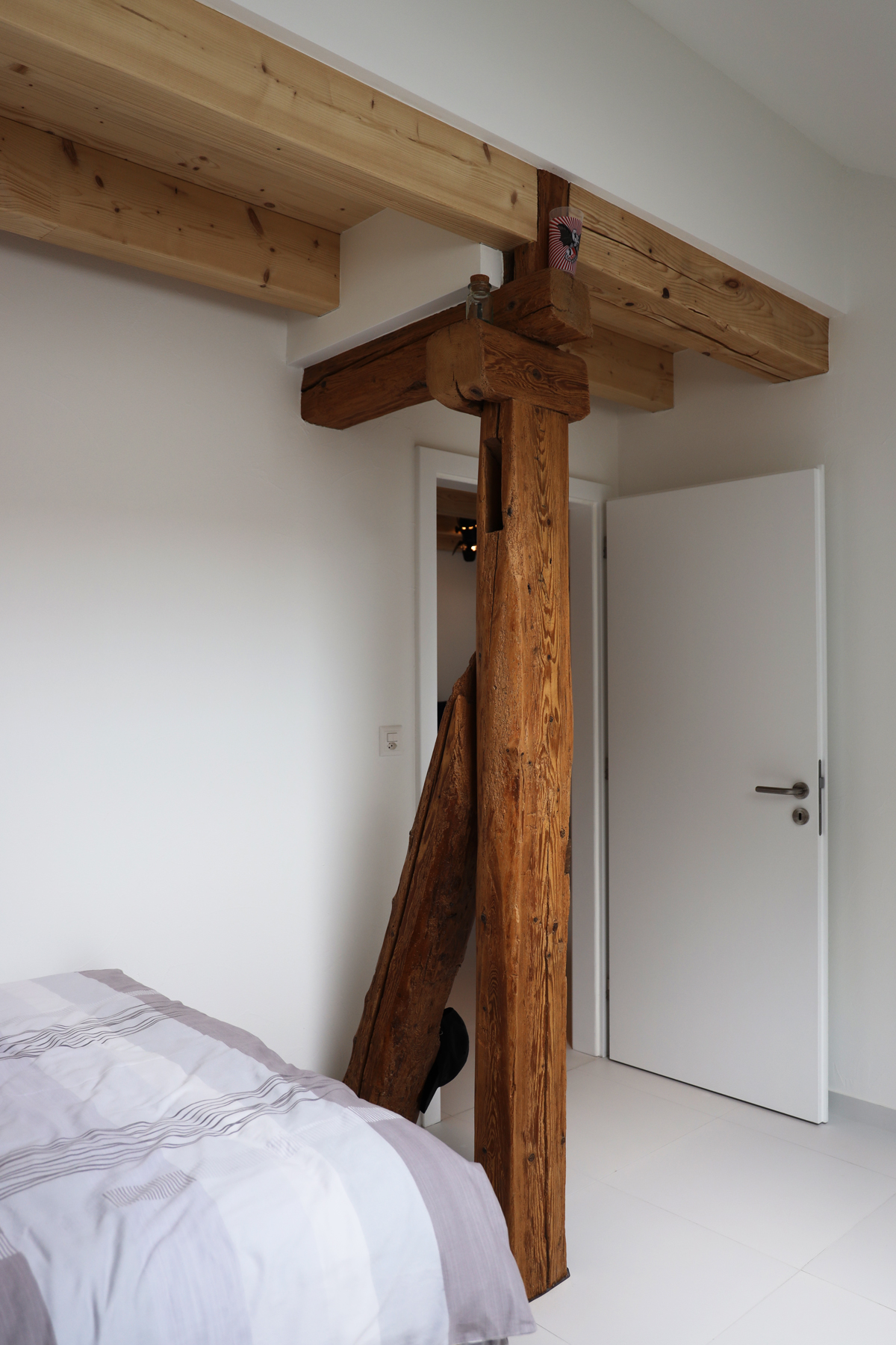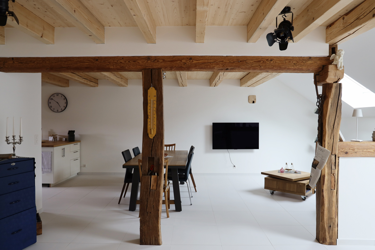 Bei den alten Holzbalken wurde bis auf die tragfähige Holzoberfläche abgeschliffen und bei den neu eingesetzten Holzbalken die Oberfläche mit UV-Täferlack vor der späteren Vergrauung geschützt.