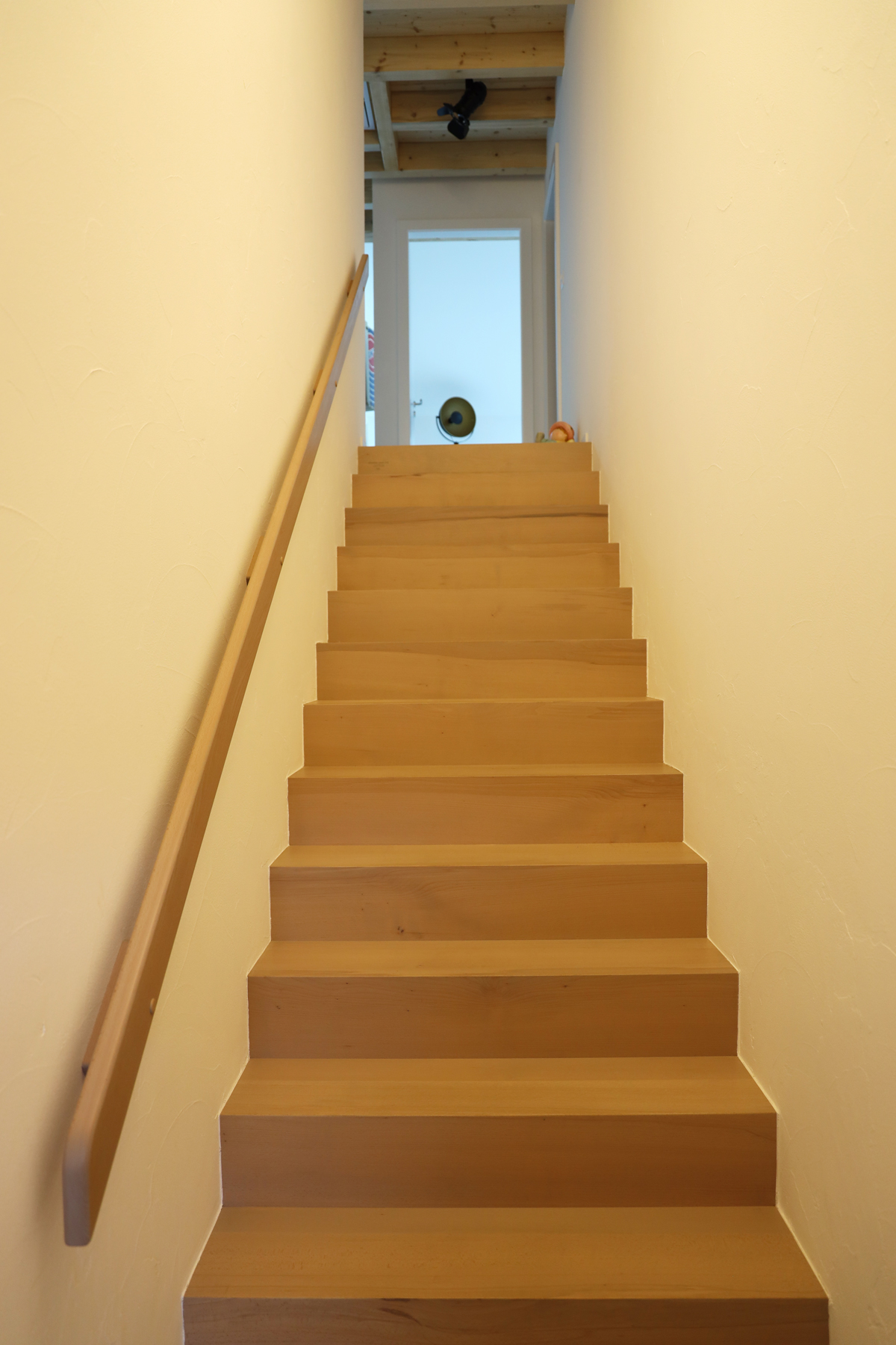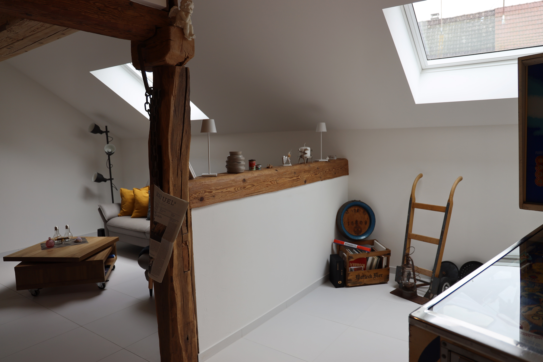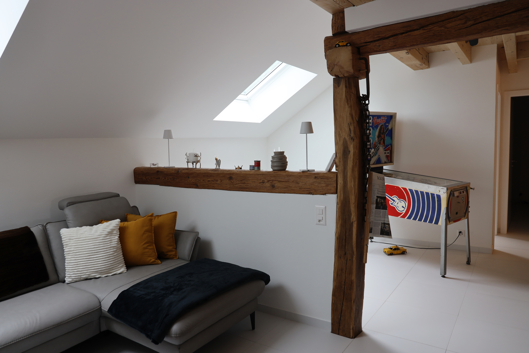 Bei den alten Holzbalken wurde bis auf die tragfähige Holzoberfläche abgeschliffen und bei den neu eingesetzten Holzbalken die Oberfläche mit UV-Täferlack vor der späteren Vergrauung geschützt.